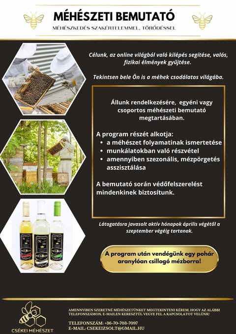 Szeretnéd testközelből megismerni, hogyan születik a méz, és miért olyan különlegesek a méhek? Élmény méhészetünkben biztonságos, vezetett programon keresztül mutatjuk be a kaptárak titkos életét, közvetlen, barátságos hangulatban. Gyerekeknek és felnőtteknek egyaránt szóló programunkon megtudhatod, hogyan dolgozik egy méhcsalád, miért nélkülözhetetlenek a méhek a természetben, és hogyan óvhatjuk őket közösen.